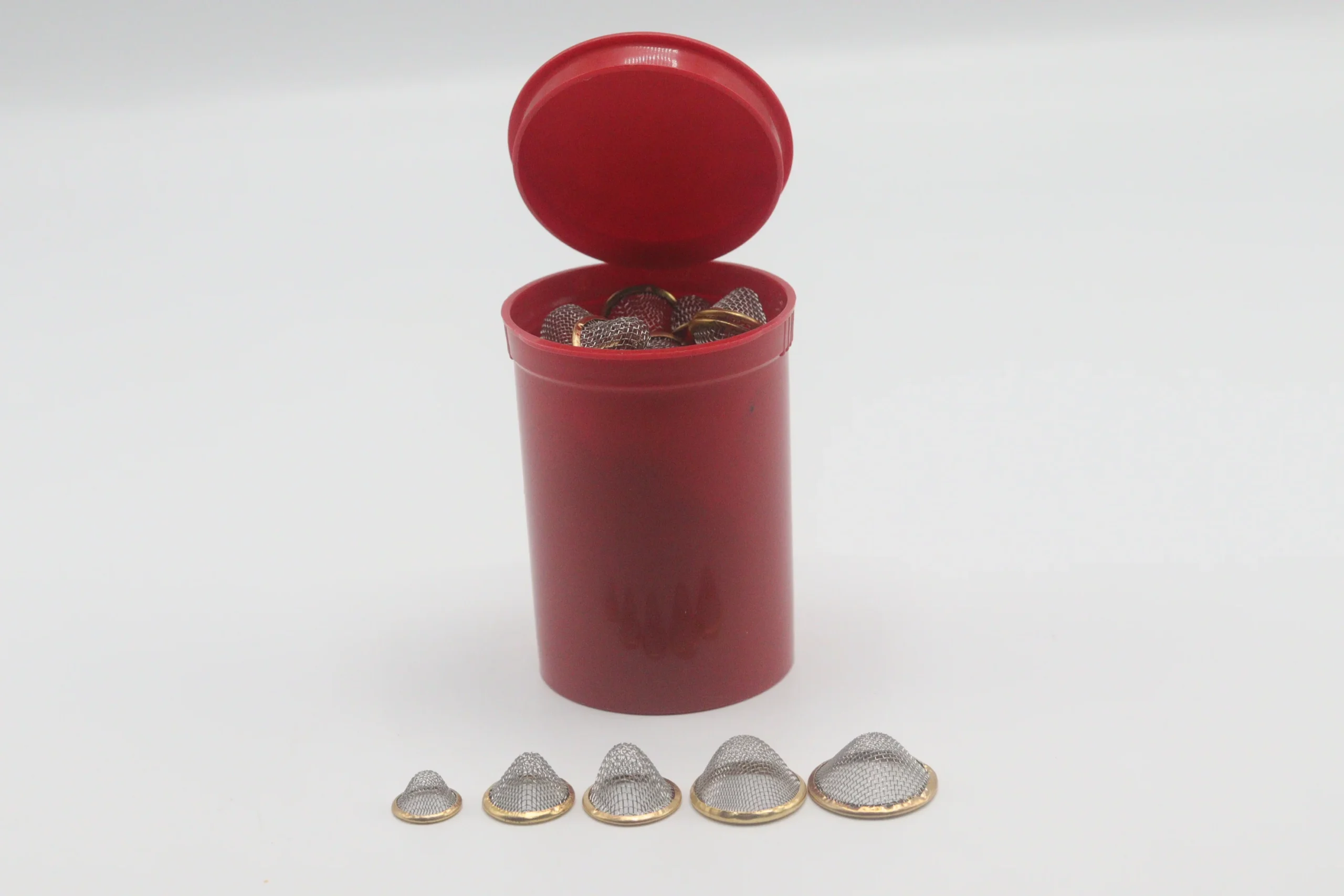 Enhance filtration and airflow performance with our 20-piece set of conical gauze filter screens, neatly packed in a durable 30-dram pop-top container. Designed for convenience and organization, this set includes multiple sizes to suit a variety of small filtration applications.