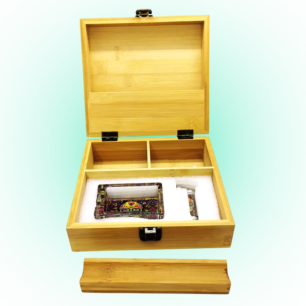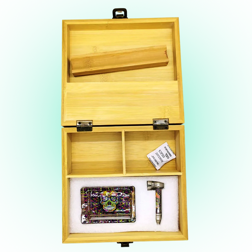 Skull Snuff Wooden Box – Large Wooden Tobacco Rolling Box with Glass Ashtray & Smoking Pipe
